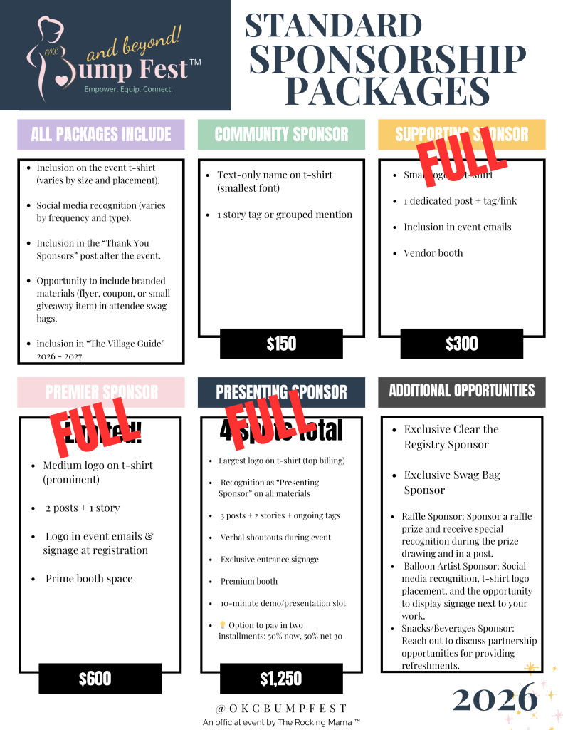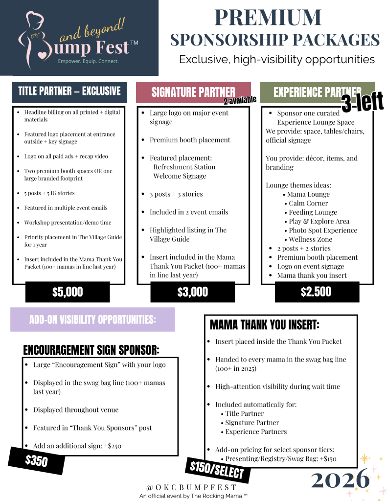 Whether you’re a small local business or a major community partner, OKC Bump & Beyond Fest offers a range of sponsorship opportunities designed to connect you directly with Oklahoma families in meaningful, memorable ways.